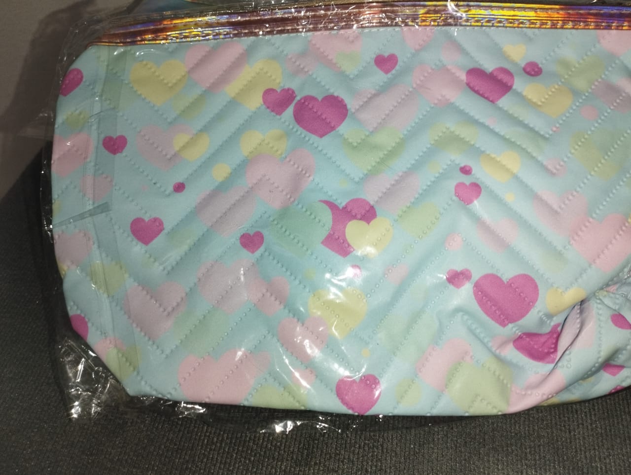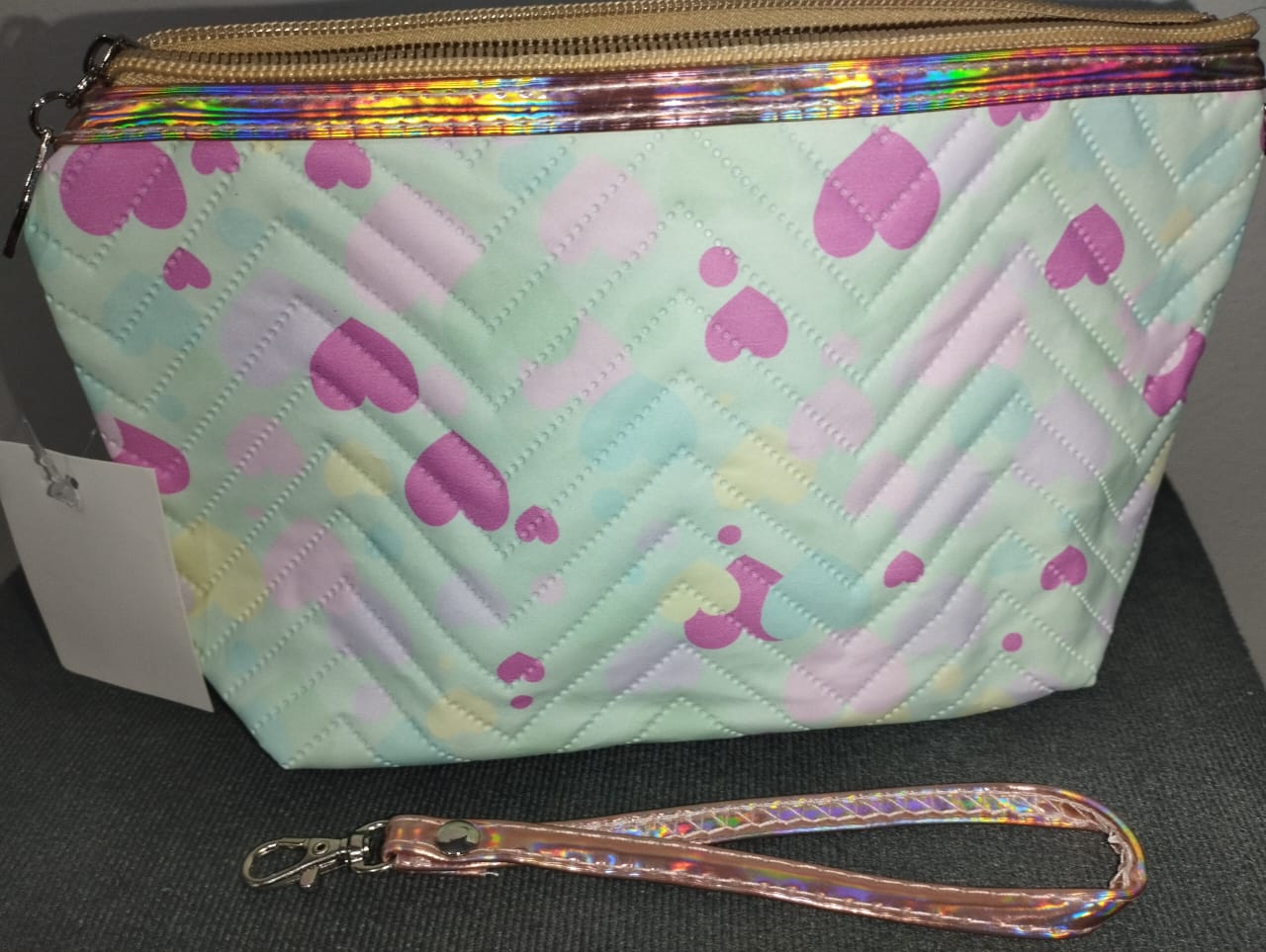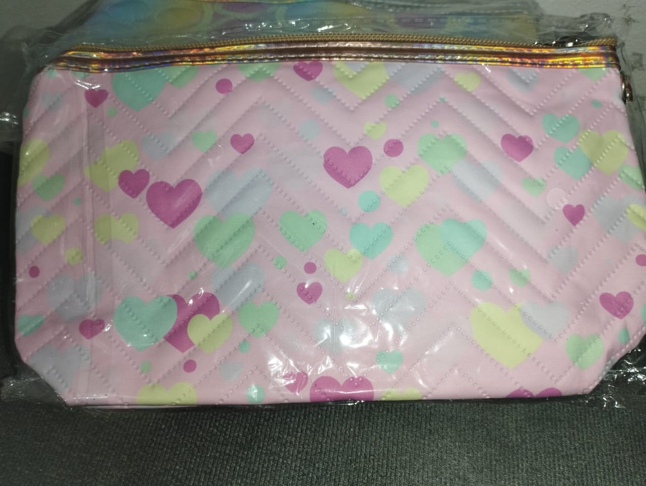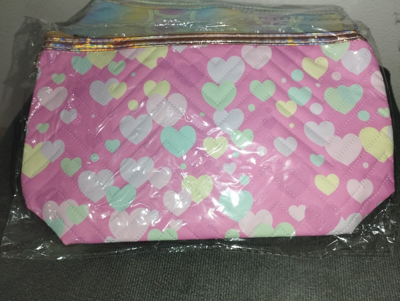 Prática, leve e estilosa, ideal para organizar maquiagens, cosméticos, acessórios ou itens pessoais. Possui fechamento em zíper e estampa colorida de corações, trazendo charme e delicadeza ao seu dia a dia.