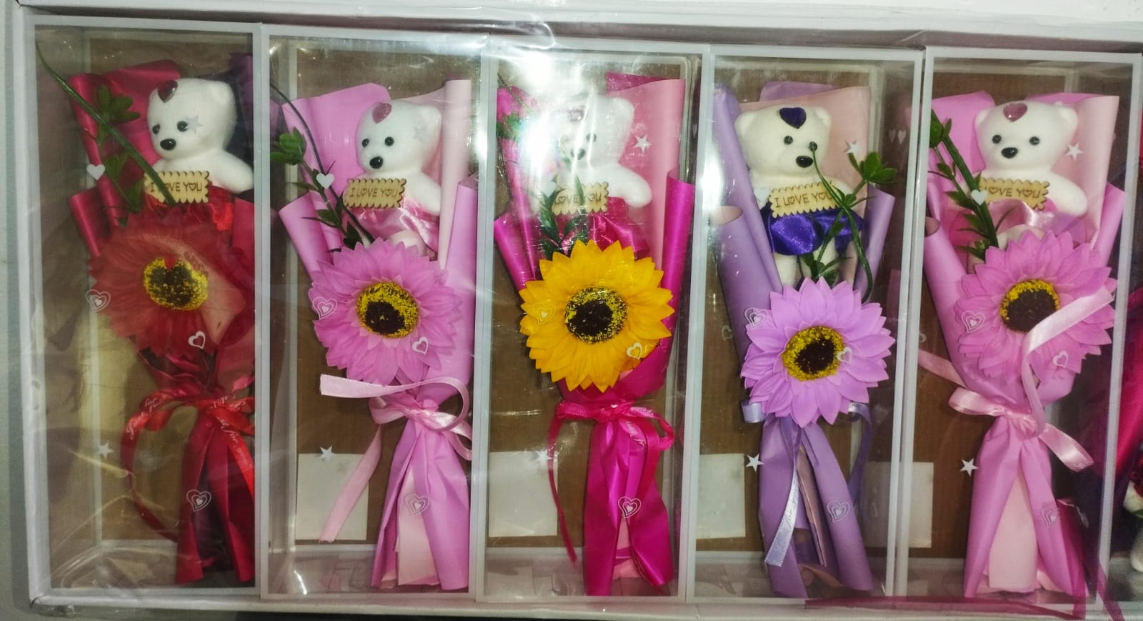 Cada kit é cuidadosamente montado, incluindo um urso de pelúcia com a placa “I LOVE YOU” e uma flor artificial delicadamente decorada com laços de fita. Disponível em diversas cores e embalagens, proporcionando uma opção personalizada para cada ocasião e gosto.