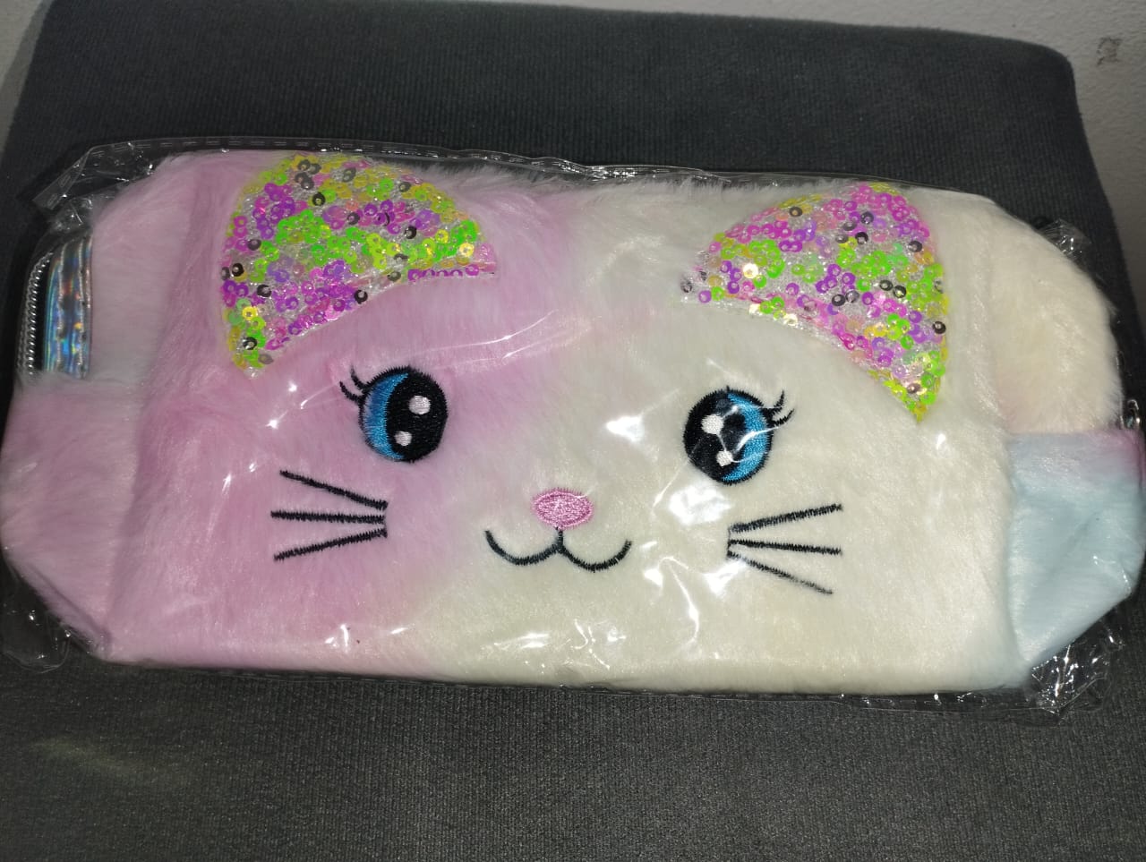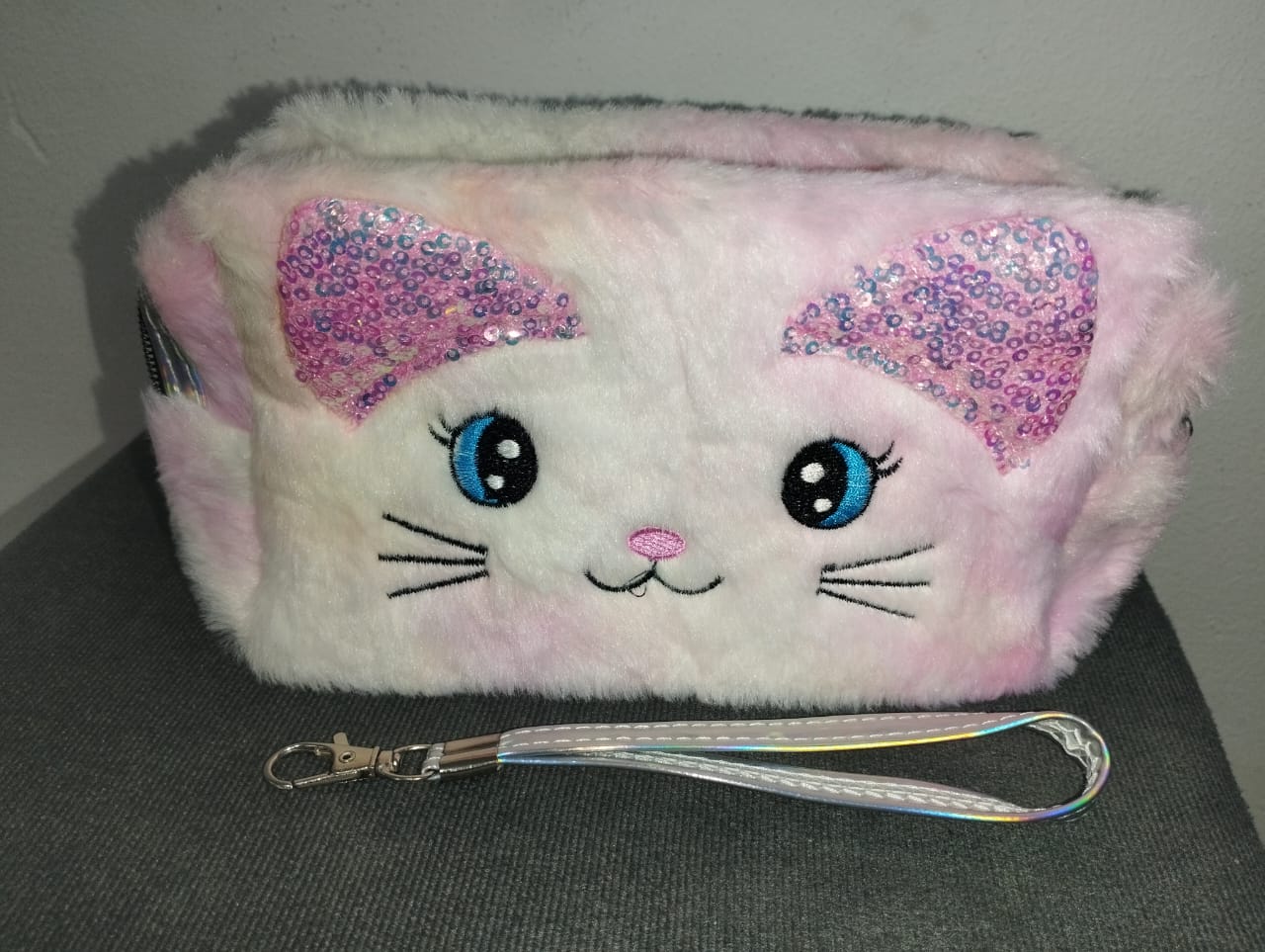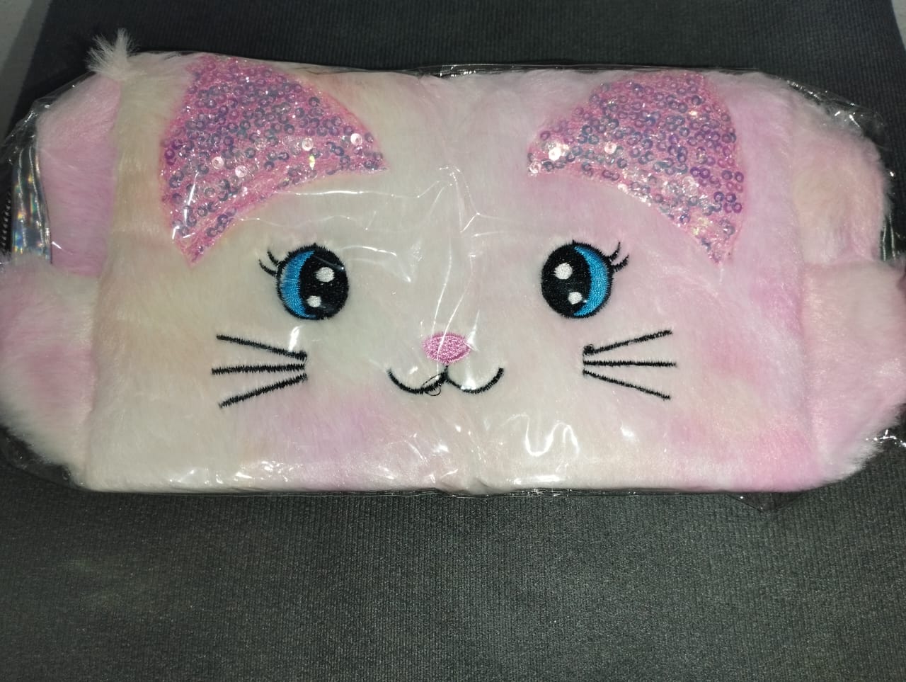 Feita em pelúcia supermacia, ela possui formato de gatinho com orelhas decoradas em lantejoulas coloridas, olhos bordados e nariz rosa delicado, trazendo um visual encantador e único.