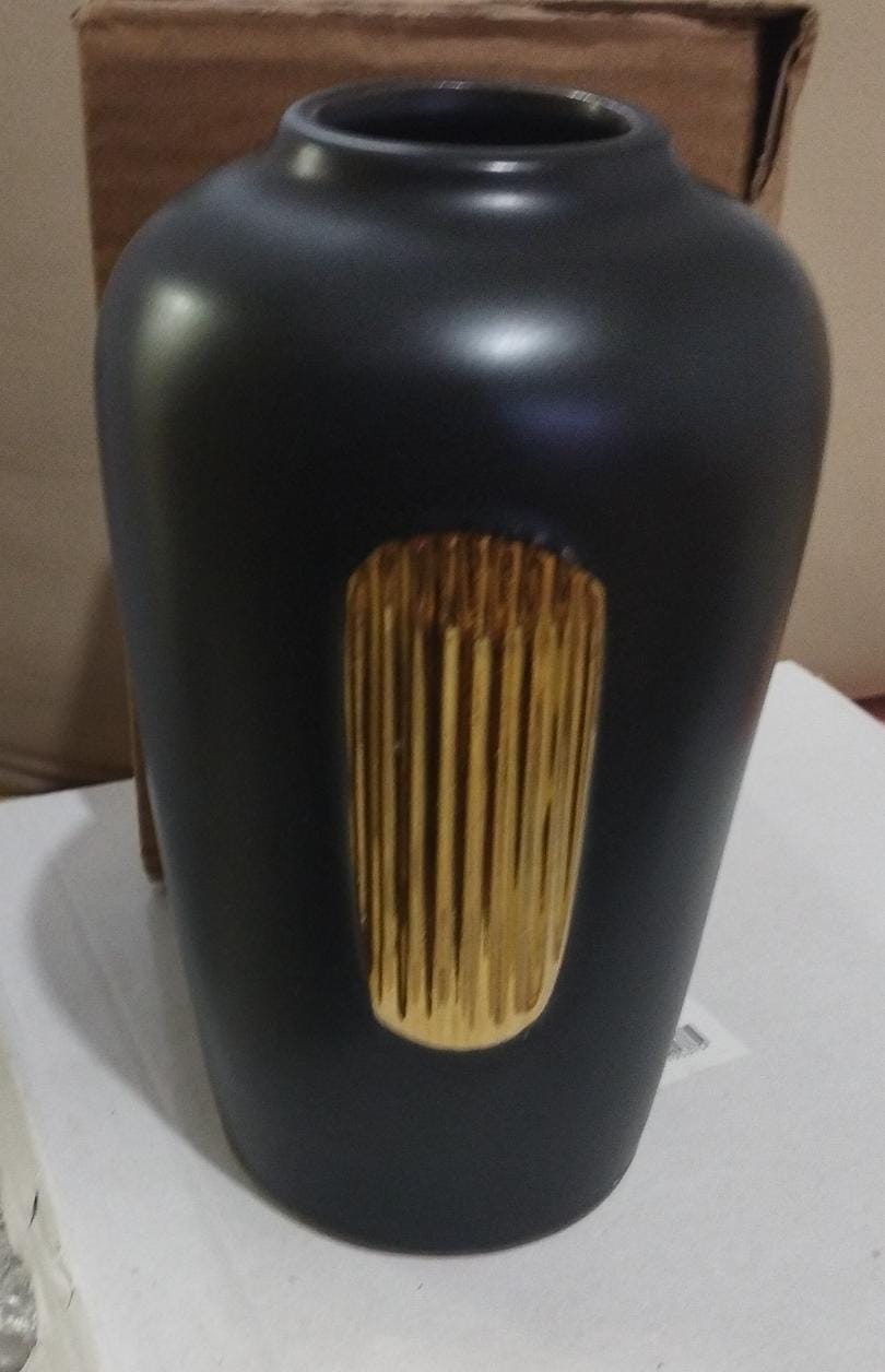 Transforme sua decoração com este vaso sofisticado, perfeito para sala, quarto, escritório ou hall de entrada. Seu design moderno em preto fosco com detalhe em dourado texturizado traz charme e requinte para qualquer ambiente.